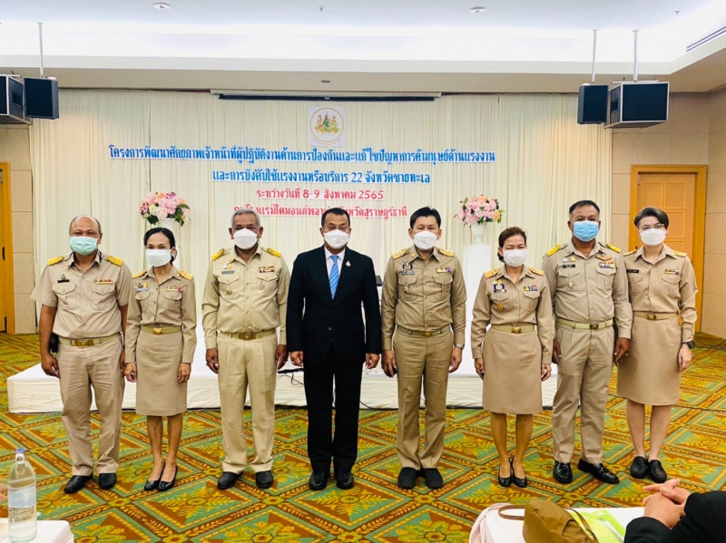 นายประเวศ ไทยประยูร รองผู้ว่าราชการจังหวัดสุราษฎร์ธานี พร้อมด้วยหัวหน้าส่วนราชการในสังกัดกระทรวงแรงงาน และผู้เกี่ยวข้อง ให้เกียรติเข้าร่วมในพิธีเปิดการประชุมเชิงปฏิบัติการโครงการพัฒนาศักยภาพเจ้าหน้าที่ผู้ปฏิบัติงานด้านการป้องกันและแก้ไขปัญหาการค้ามนุษย์ด้านแรงงาน และการบังคับใช้แรงงานหรือบริการ 22 จังหวัดชายทะเล โดยศูนย์บัญชาการป้องกันการค้ามนุษย์ด้านแรงงาน กระทรวงแรงงาน จัดขึ้นระหว่างวันที่ 8 - 9 สิงหาคม 2565 ณ โรงแรมไดมอนด์ พลาซ่า สุราษฎร์ธานี โดยมีนายวรรณรัตน์ ศรีสุกใส รองปลัดกระทรวงแรงงาน เป็นประธานในพิธีเปิด วัตถุประสงค์เพื่อให้ผู้เข้ารับการอบรมมีความรู้ความเข้าใจเกี่ยวกับนโยบาย กฎหมาย ระเบียบแนวปฏิบัติที่เกี่ยวข้องกับการบังคับใช้แรงงานหรือบริการ มาตรฐานการปฏิบัติงาน (Standard Operating Procedure : SOP) แผนปฏิบัติการว่าด้วยกลไกกรส่งต่อระดับชาติ และสามารถนำความรู้ที่ได้รับไปขับเคลื่อนการดำเนินงานในพื้นที่ได้อย่างมีประสิทธิภาพ โดยผู้เข้าร่วมการประชุม ได้แก่ ผู้บริหารระดับสูงของกระทรวงแรงงาน ข้าราชการ และเจ้าหน้าที่ในสังกัดกระทรวงแรงงาน และองค์กรพัฒนาเอกชน (NGO) รวมจำนวน 40 คน