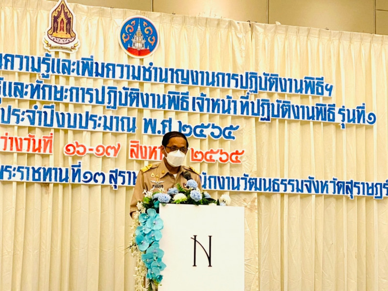 นายนันธวัช เจริญวรรณ รองผู้ว่าราชการจังหวัดสุราษฎร์ธานี เป็นประธานในพิธีเปิดโครงการทบทวนความรู้และเพิ่มความชำนาญงานการปฏิบัติงานพิธีฯ หลักสูตรทบทวนความรู้และทักษะการปฏิบัติงานพิธีเจ้าหน้าที่ปฏิบัติงานพิธี รุ่นที่ 1 ประจำปีงบประมาณ 2565 ซึ่งมีเจ้าหน้าที่ผู้เข้าร่วมโครงการจาก จังหวัดนครศรีธรรมราช จังหวัดชุมพร และจังหวัดสุราษฎร์ธานี