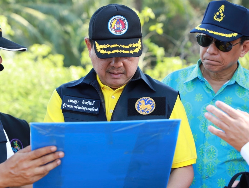 ผู้ว่าราชการจังหวัดสุราษฎร์ธานี ลงพื้นที่ติดตามสถานการณ์ภัยแล้งอำเภอบ้านนาเดิม สั่งการ ปภ. ร่วมกับท้องถิ่น แก้ไขปัญหาให้กับประชาชน พร้อมกับสำรวจโครงการก่อสร้างคันดินกั้นน้ำอ่างเก็บน้ำแก้มลิงทุ่งปากขอ เสริมศักยภาพกักเก็บน้ำ