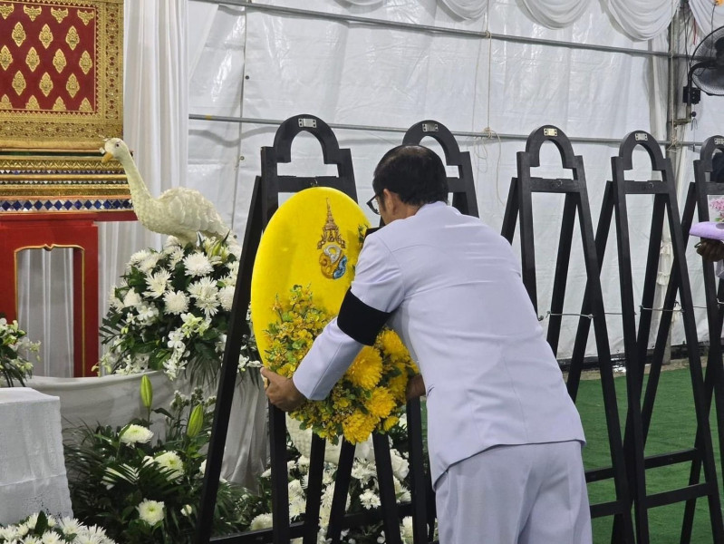 รองผู้ว่าราชการจังหวัดสุราษฎร์ธานีเชิญพวงมาลาพระราชทานและพวงมาลาประทาน วางที่หน้าหีบศพ ดาบตำรวจบรรเจิด พุทธเจริญ ที่เสียชีวิตจากเหตุคนร้ายใช้อาวุธปืนซุ่มยิงในพื้นที่จังหวัดปัตตานี