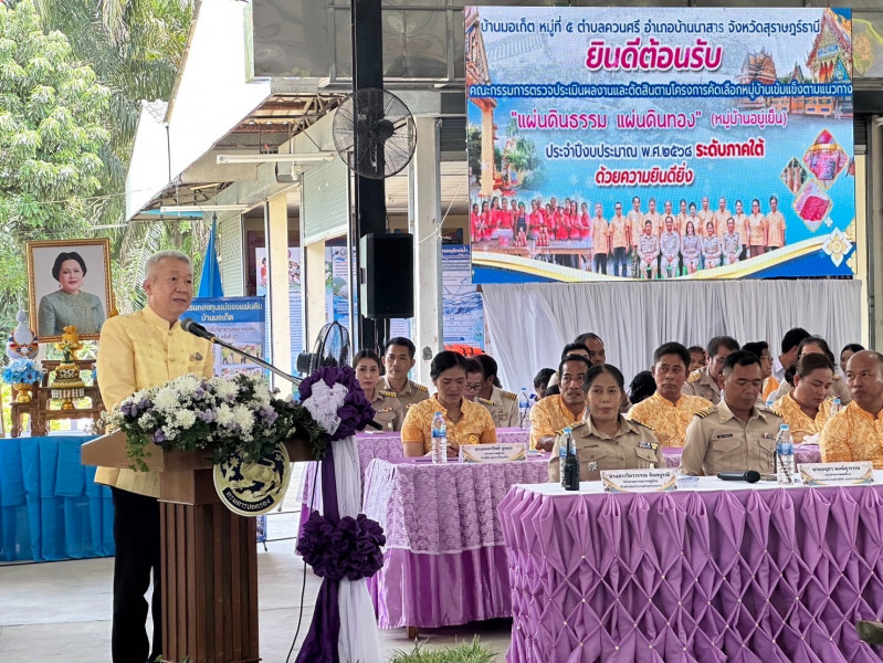 นายบันดาล สถิรชวาล รองผู้ว่าราชการจังหวัดสุราษฎร์ธานี ให้การต้อนรับนายวิรุฬห์ สิทธิวงศ์ รองอธิบดีกรมการปกครอง พร้อมด้วย คณะกรรมการตัดสินและคัดเลือกหมู่บ้านเข้มแข็งตามแนวทาง "แผ่นดินธรรม แผ่นดินทอง" (หมู่บ้านอยู่เย็น) ประจำปี 2568 ระดับภาค ณ บ้านมอเก็ต หมู่ที่ 5 ตำบลควนศรี อำเภอบ้านนาสาร จังหวัดสุราษฎร์ธานี