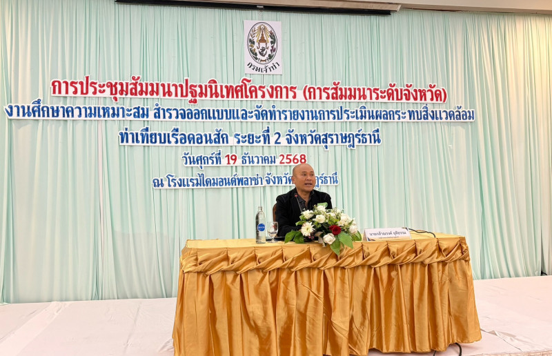 นายกล้าณรงค์ ยุติธรรม รองผู้ว่าราชการจังหวัดสุราษฎร์ธานี เป็นประธานเปิดการประชุมสัมมนาระดับจังหวัดครั้งที่ 1 (การประชุมปฐมนิเทศโครงการ) งานศึกษาความเหมาะสม สำรวจออกแบบ และจัดทำรายงานการประเมินผลกระพบสิ่งแวดล้อม ท่าเทียบเรือดอนสัก ระยะที่ 2 จังหวัดสุราษฎร์ธานี โดยกรมเจ้าท่า ร่วมกับบริษัทที่ปรึกษา และภาคส่วนที่เกี่ยวข้อง จัดขึ้น ณ โรงแรมไดมอนด์ พลาซ่า จ.สุราษฎร์ธานี พร้อมกับเชิญตัวแทนหน่วยงานราชการ และผู้มีส่วนเกี่ยวข้องในธุรกิจขนส่งสินค้าทางทะเล ทั้งในและต่างประเทศ ตัวแทนสายการเดินเรือ ผู้ประกอบการเดินเรือ สมาคมที่เกี่ยวข้อง องค์กรปกครองส่วนท้องถิ่น สื่อมวลชน และเครือข่ายภาคประชาชนเข้าร่วม เพื่อได้รับทราบเหตุผลความจำเป็นของโครงการ ตำแหน่งที่ตั้งที่มีความเป็นไปไปได้ การลดผลกระทบทางด้านสิ่งแวดล้อม พื้นที่การใช้ประโยชน์ และกฎหมายสำคัญที่เกี่ยวข้อง รวมทั้งแนวทางการร่วมลงทุน ตลอดจนรับฟังข้อคิดเห็น ข้อเสนอแนะ เพื่อใช้เป็นข้อมูลการศึกษาต่อไป