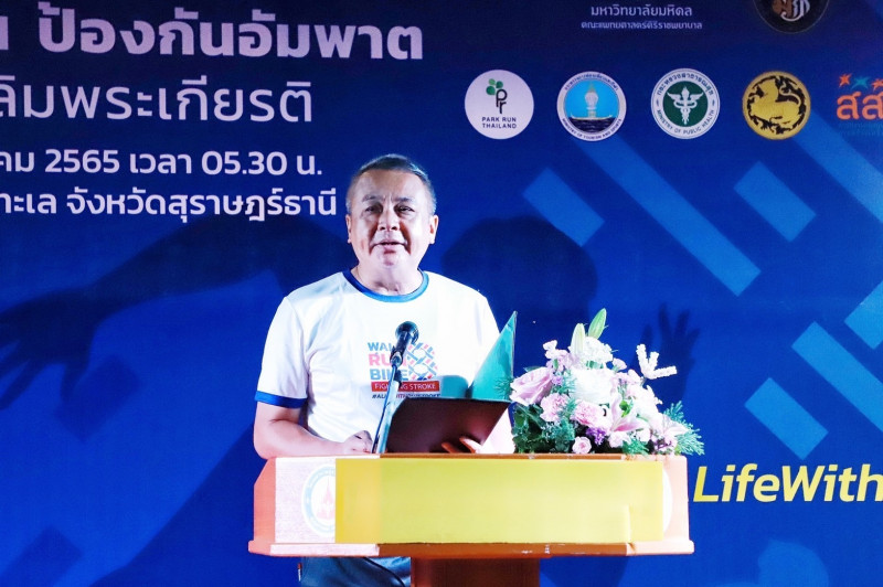 นายวิชวุทย์ จินโต ผู้ว่าราชการจังหวัดสุราษฎร์ธานี เป็นประธานพิธีเปิดกิจกรรม เดิน วิ่ง ปั่น ป้องกันอัมพาตครั้งที่ 8 เฉลิมพระเกียรติฯ ตามโครงการแสงนำใจ ไทยทั้งชาติ โดยมี นพ.จิรชาติ เรืองวัชรินทร์ นายแพทย์สาธารณสุขจังหวัดสุราษฎร์ธานี กล่าวรายงาน พร้อมด้วยหัวหน้าส่วนราชการ องค์กรภาครัฐภาค ภาคเอกชนประชาชน และนักวิ่งเข้าร่วมกว่า 2,000 คน