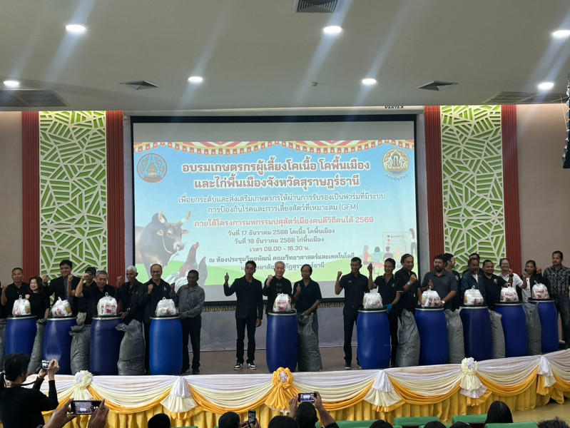 นายบันดาล สถิรชวาล รองผู้ว่าราชการจังหวัดสุราษฎร์ธานี เป็นประธานกิจกรรมฝึกอบรมเกษตรกรผู้เลี้ยงโคเนื้อ โคพื้นเมือง และไก่พื้นเมืองในพื้นที่จังหวัดสุราษฎร์ธานีภายใต้โครงการมหกรรมปศุสัตว์เมืองคนดีวิถีคนใต้ ประจำปีงบประมาณ 2569 ณ ณ ห้องประชมวิทยพัฒน์ คณะวิทยาศาสตร์และเทคโนโลยี มหาวิทยาลัยราชภัฎสุราษฎร์ธานี โดยมีหน่วยงานภาครัฐ ภาคเอกชน และประชาชนเข้าร่วมกิจกรรม