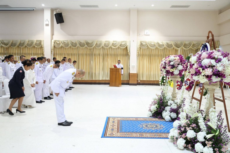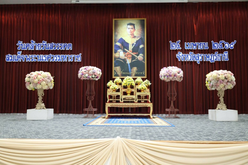 นายกล้าณรงค์ ยุติธรรม รองผู้ว่าราชการจังหวัดสุราษฎร์ธานี เป็นประธานประกอบพิธีวางพวงมาลาถวายราชสักการะ เนื่องในวันคล้ายวันสวรรคตสมเด็จพระนเรศวรมหาราช ประจำปี 2569 ณ อาคารศูนย์กลางการประชุมสัมมนาภาคใต้ตอนบน ศาลากลางจังหวัดสุราษฎร์ธานี โดยมี ศาล ทหาร ตำรวจ หัวหน้าส่วนราชการ ผู้บริหารองค์กรปกครองส่วนท้องถิ่น สถาบันการศึกษา ข้าราชการและเจ้าหน้าที่ ตลอดจนพสกนิกรทุกหมู่เหล่า เข้าร่วมพิธี เพื่อแสดงออกถึงความจงรักภักดี และน้อมรำลึกในพระมหากรุณาธิคุณอันหาที่สุดมิได้ของสมเด็จพระนเรศวรมหาราช ผู้ทรงเป็นวีรกษัตริย์ผู้กอบกู้เอกราชและธำรงไว้ซึ่งอธิปไตยของชาติไทย