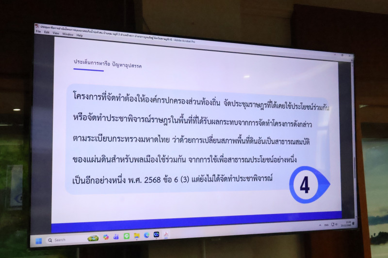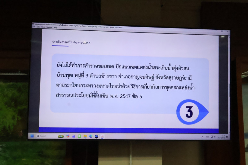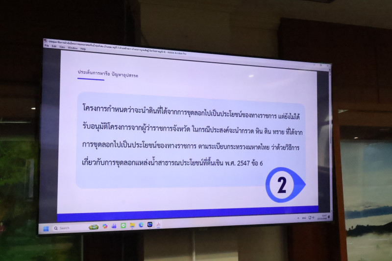 นอกจากนี้ยังไม่ได้ทำการสำรวจขอบเขต ปักแนวเขตแหล่งน้ำสระเก็บน้ำ ตามระเบียบกระทรวงมหาดไทย และโครงการที่จัดทำต้องให้องค์กรปกครองส่วนท้องถิ่น จัดประชุมราษฎรที่เคยใช้ประโยชน์ร่วมกัน หรือจัดทำประชาพิจารณ์ราษฎรในพื้นที่ ที่ได้รับผลกระทบจากการจัดทำโครงการดังกล่าว ตามระเบียบกระทรวงมหาดไทย แต่ยังไม่ได้จัดทำประชาพิจารณ์ จึงได้เชิญหน่วยงานและผู้ที่เกี่ยวข้อง เข้าร่วมประชุมหารือในวันนี้ เพื่อให้การดำเนินการให้เป็นไปด้วยความเรียบร้อย ถูกต้องตามระเบียบของทางราชการ รวมถึงข้อกฎหมายต่างๆ อันจะก่อให้เกิดประโยชน์สูงสุดต่อพี่น้องประชาชนในพื้นที่ต่อไป.