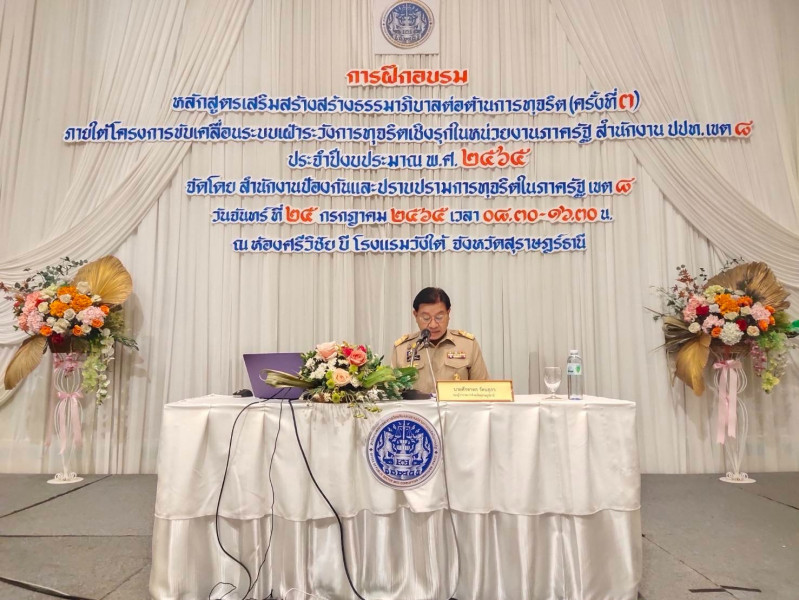 นายศักดาพร รัตนสุภา รองผู้ว่าราชการจังหวัดสุราษฎร์ธานี เป็นประธานเปิดการฝึกอบรมหลักสูตรเสริมสร้างธรรมาภิบาลต่อต้านการทุจริต (ครั้งที่ 3) ภายใต้โครงการขับเคลื่อนระบบเฝ้าระวังการทุจริตเชิงรุกในหน่วยงานภาครัฐ สำนักงานปปท.เขต 8 ประจำปีงบประมาณ พ.ศ.2565 โดยโครงการดังกล่าวเป็นการนำหลักสูตร เสริมสร้างธรรมาภิบาลต่อต้านการทุจริต มาใช้เป็นเครื่องมือในการปลุกจิตสำนึกเจ้าหน้าที่ของรัฐตามหลักธรรมาภิบาลต่อต้านการทุจริต เพื่อขับเคลื่อนนโยบายของรัฐบาลในการต่อสู้กับปัญหาการทุจริตในการขับเคลื่อนยุทธศาสตร์ชาติ ซึ่งการฝึกอบรมครั้งนี้มีกลุ่มเป้าหมายเป็นเจ้าหน้าที่รัฐสังกัดองค์กรปกครองส่วนท้องถิ่น จำนวน 150 คน จาก 138 หน่วยงาน
