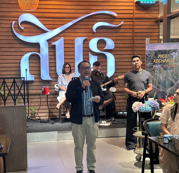 นายบันดาล สถิรชวาล รองผู้ว่าราชการจังหวัดสุราษฎร์ธานี กล่าวต้อนรับกิจกรรม Networking Dinner ภายใต้โครงการบูรณาการส่งเสริมการท่องเที่ยวเชิงธุรกิจ: ไมซ์สร้างสรรค์ รวมพลังชุมชนภาคใต้ ณ ร้านสินธุ์ จังหวัดสุราษฎร์ธานี