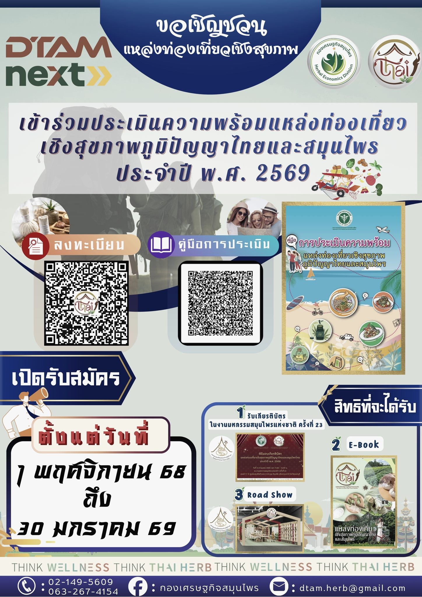 ประชาสัมพันธ์ เปิดรับสมัครแหล่งท่องเที่ยวเชิงสุขภาพภูมิปัญญาไทยและสมุนไพรข้าร่วมประเมินความพร้อมแหล่งท่องเที่ยวเชิงสุขภาพฯ ประจำปี 2569 ของ กองเศรษฐกิจสมุนไพร กรมการแพทย์แผนไทยและการแพทย์ทางเลือก