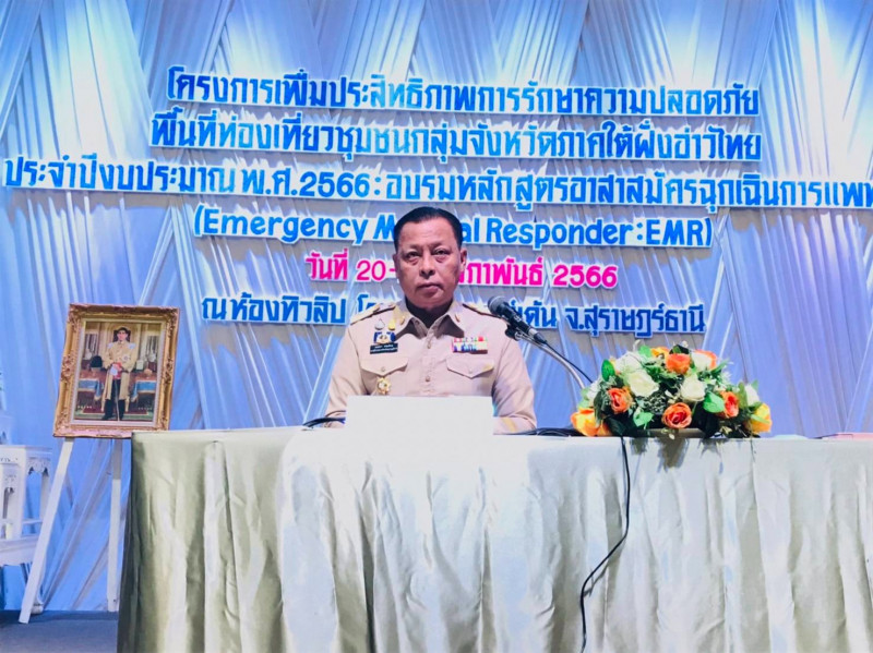 นายมนตรา พรมสินธุ รองผู้ว่าราชการจังหวัดสุราษฎร์ธานี เป็นประธานการเปิดโครงการเพิ่มประสิทธิภาพการรักษาความปลอดภัยพื้นที่ท่องเที่ยวชุมชน กลุ่มจังหวัดภาคใต้ฝั่งอ่าวไทย กิจกรรมอมรมหลักสูตรอาสาสมัครฉุกเฉินการแพทย์(Emergency Medical Responder EMR )รุ่นที่ 1 ซึ่งจัดขึ้นระหว่างวันที่ 20-24 กุมภาพันธ์ 2566 ณ.โรงแรมนิภาการ์เด้น อำเภอเมืองสุราษฎร์ธานี จังหวัดสุราษฎร์ธานี โดยมีนายบุญเรือง หลงละลวด หัวหน้าสำนักงานป้องกันและบรรเทาสาธารณภัยจังหวัดสุราษฎร์ธานี เป็นผู้กล่าวรายงาน