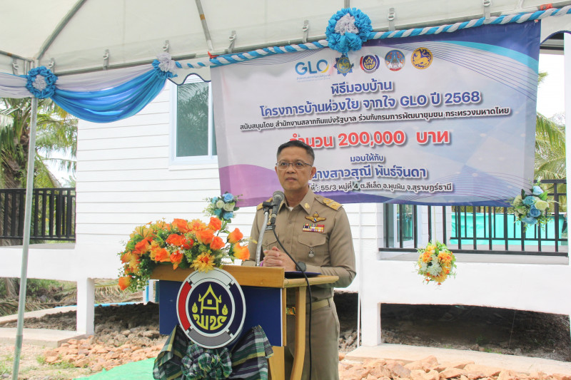 นายธีรุตม์ ศุภวิบูลย์ผล ผู้ว่าราชการจังหวัดสุราษฎร์ธานี เป็นประธานในพิธีส่งมอบบ้าน ตามโครงการ “บ้านห่วงใยจาก GLO ประจำปี พ.ศ. 2568” จำนวน 1 หลัง มูลค่า 200,000 บาท เพื่อยกระดับคุณภาพชีวิตและความเป็นอยู่ที่ดีขึ้นของประชาชนในทุกช่วงวัย ตลอดจนการขจัดความยากจนตามเป้าหมายการพัฒนาอย่างยั่งยืน ณ ครัวเรือน นางสาวสุณี พันธ์จินดา บ้านเลขที่ 55/3 หมู่ที่ ตำบลลีเล็ด อำเภอพุนพิน จังหวัดสุราษฎร์ธานี โดยมีนายประโมทย์ ดำจวนลม พัฒนาการจังหวัดสุราษฎร์ธานี หัวหน้าส่วนราชการ นายอำเภอพุนพิน กำนัน/ผู้ใหญ่บ้าน ผู้บริการองค์กรปกครองส่วนท้องถิ่น และประชาชนในพื้นที่ เข้าร่วมพิธี