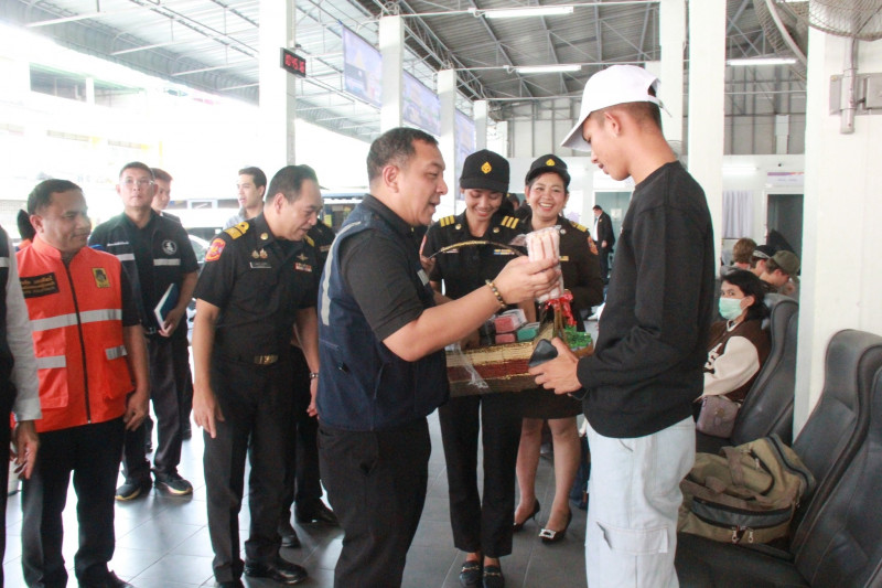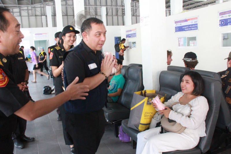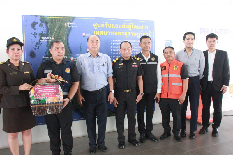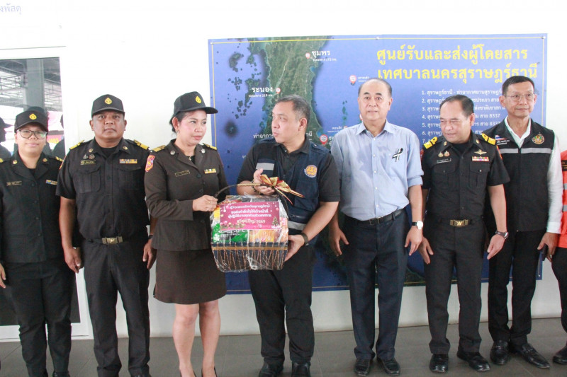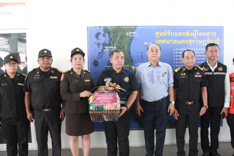 โอกาสนี้ ผู้ว่าราชการจังหวัดสุราษฎร์ธานี ได้กล่าวทักทายเจ้าหน้าที่ประจำจุดให้บริการ รวมทั้งพนักงานขับรถโดยสาร และประชาชนที่มาใช้บริการ ให้เดินทางถึงจุดหมายปลายทางอย่างปลอดภัย พร้อมกับมอบของขวัญปีใหม่ในเทศกาลแห่งความสุขนี้ด้วย.