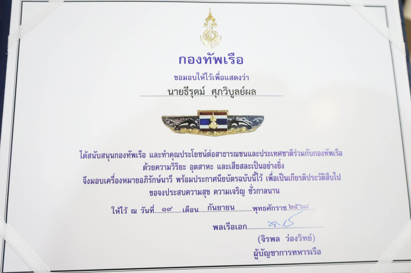 ในโอกาสนี้ ผู้บัญชาการทัพเรือภาคที่ 2 ได้มอบ เครื่องหมายเชิดชูเกียรติ “อภิรักษ์นาวี” แก่ผู้ว่าราชการจังหวัดสุราษฎร์ธานี เพื่อเชิดชูเกียรติแก่บุคคลหรือองค์กรที่ให้การสนับสนุนกองทัพเรือในการดำเนินกิจกรรมที่เป็นประโยชน์ต่อสาธารณชนและประเทศชาติอย่างโดดเด่นและเพื่อให้เป็นสัญลักษณ์แห่งความภาคภูมิใจและเป็นการยกย่องบุคคลที่สร้างคุณประโยชน์ให้แก่สังคมและประเทศชาติต่อไป