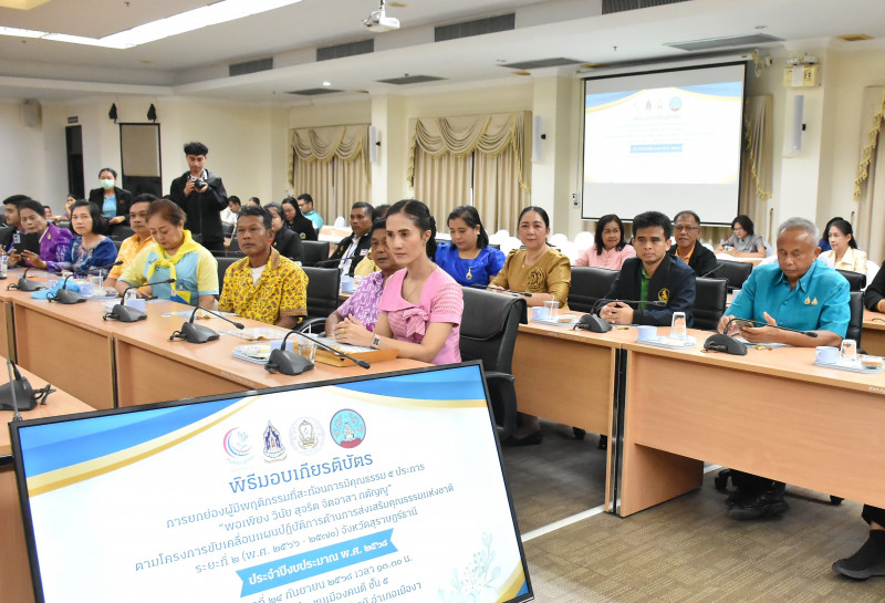 จังหวัดสุราษฎร์ธานี โดยสำนักงานวัฒนธรรมจังหวัดสุราษฎร์ธานี ได้ดำเนินการคัดเลือกบุคลากรที่มีพฤติกรรมที่สะท้อนการมีคุณธรรม ๕ ประการ"พอเพียง วินัย สุจริต จิตอาสา กตัญญ" เข้ารับเกียรติบัตรจากประธานคณะอนุกรรมการส่งเสริมคุณธรรมจังหวัดสุราษฎร์ธานี ประกอบด้วย คณะอนุกรรมการส่งเสริมคุณธรรมจังหวัดสุราษฎร์ธานี จำนวน ๒๑ องค์กร ชุมชนคุณธรรมต้นแบบ จำนวน ๒ ชุมชน อำเภอ ๑๙ อำเภอ และองค์กรที่มีผลการประเมินองค์กรคุณธรรมต้นแบบและองค์กรพัฒนาคุณธรรม จำนวน ๓๑ องค์กร