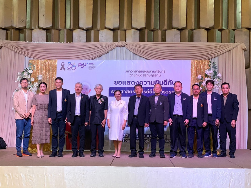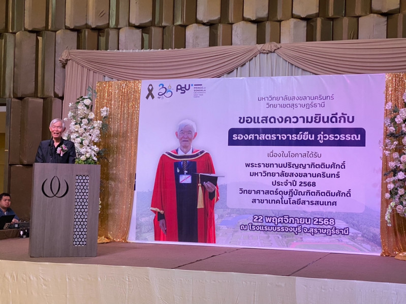 นายบันดาล สถิรชวาล รองผู้ว่าราชการจังหวัดสุราษฎร์ธานี ร่วมแสดงความยินดีรองศาสตราจารย์ยืน ภู่วรรณ ในโอกาสเข้ารับพระราชทานปริญญาบัตรวิทยาศาสตรดุษฎีบัณฑิตกิตติมศักดิ์ สาขาเทคโนโลยีสารสนเทศ ในพิธีพระราชทานปริญญาบัตรแก่ผู้สำเร็จการศึกษา ประจำปีการศึกษา 2567 มหาวิทยาลัยสงขลานครินทร์ ณ โรงแรมบรรจงบุรี อำเภอเมืองสุราษฎร์ธานี โดยมีบุคลากรทางการศึกษาเข้าร่วมแสดงความยินดีเป็นจำนวนมาก