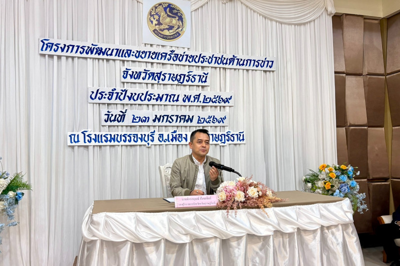 นายจักรกฤษณ์ ฝั่งชลจิตร์ รองผู้ว่าราชการจังหวัดสุราษฎร์ธานี เป็นประธานเปิดกิจกรรมอบรมโครงการพัฒนาและขยายเครือข่ายประชาชนด้านการข่าว จังหวัดสุราษฎร์ธานี ประจำปีงบประมาณ พ.ศ.2569 โดยที่ทำการปกครองจังหวัดสุราษฎร์ธานี จัดขึ้น ณ โรงแรมบรรจงบุรี อำเภอเมืองฯ จังหวัดสุราษฎร์ธานี เพื่อส่งเสริมการมีส่วนร่วมของเครือข่าย และเพิ่มประสิทธิภาพการข่าวภาคประชาชนเพื่อความมั่นคงของประเทศชาติ ส่งเสริมบทบาทของกลุ่มอาสาสมัครและเครือข่ายไปสู่การพัฒนาสังคม รวมทั้งสนับสนุนการดำเนินนโยบายของรัฐบาลในการดูแล เฝ้าระวัง และกำหนดมาตรการในการช่วยเหลือประชาชน นำไปสู่การแก้ไขปัญหาในพื้นที่อย่างถูกต้องเหมาะสม โดยคัดเลือกผู้ที่เคยผ่านการอบรมและผู้ที่ไม่เคยเข้ารับการอบรมจากอำเภอต่างๆ รวมจำนวน 20 คน เพื่อวางรากฐานบูรณาการร่วมเป็นเครือข่ายข่าวสนับสนุนการปฏิบัติงานภาครัฐต่อไป