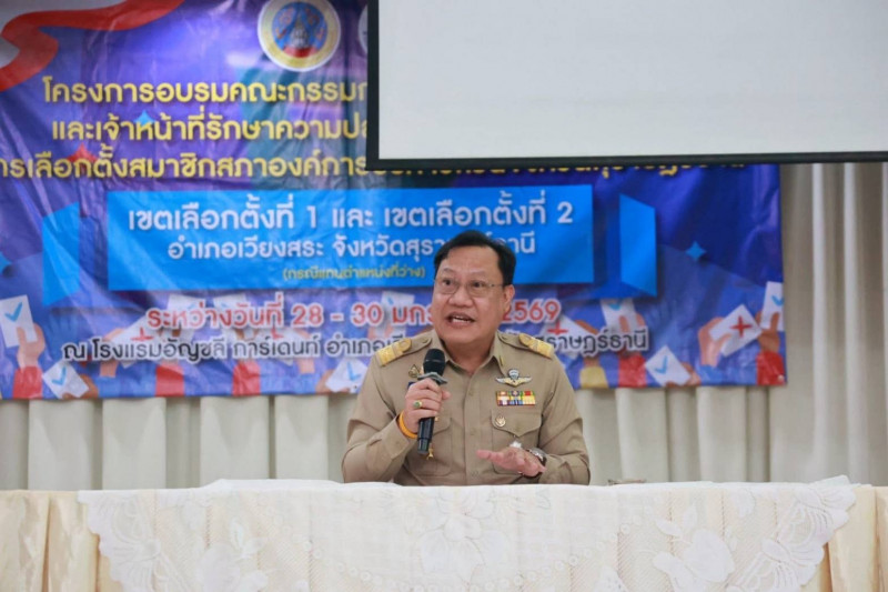 นายวิทศักดิ์ จำเริญนุสิต รองผู้ว่าราชการจังหวัดฯ ในฐานะประธานกรรมการการเลือกตั้งประจำองค์การบริหารส่วนจังหวัดสุราษฎร์ธานี พบปะและให้กำลังใจผู้เข้าร่วมโครงการอบรมคณะกรรมการประจำหน่วยเลือกตั้งและเจ้าหน้าที่รักษาความปลอดภัยประจำที่เลือกตั้ง ในการเลือกตั้งสมาชิกสภาองค์การบริหารส่วนจังหวัดสุราษฎร์ธานี เขตเลือกตั้งที่ 1 และเขตเลือกตั้งที่ 2 อำเภอเวียงสระ (กรณีแทนตำแหน่งที่ว่าง)