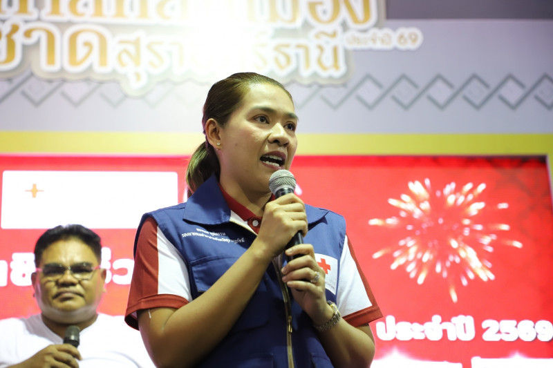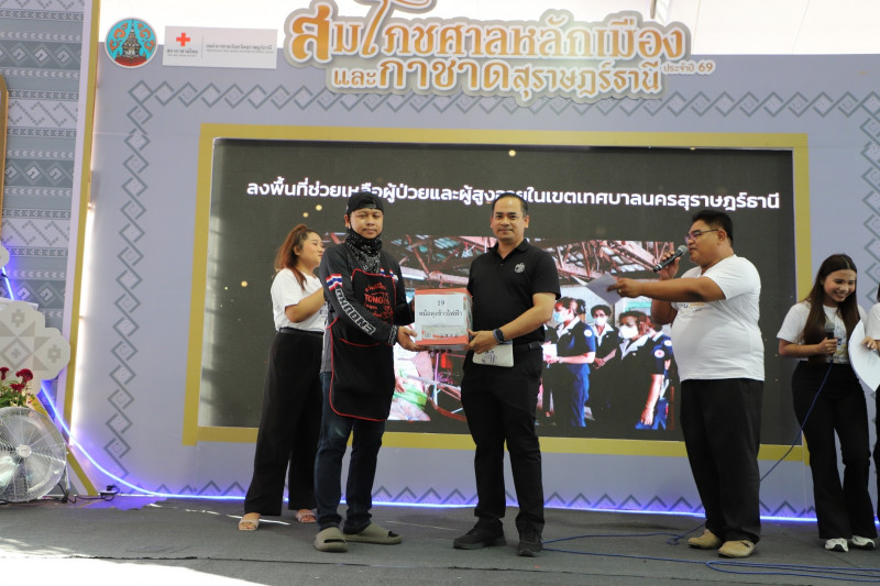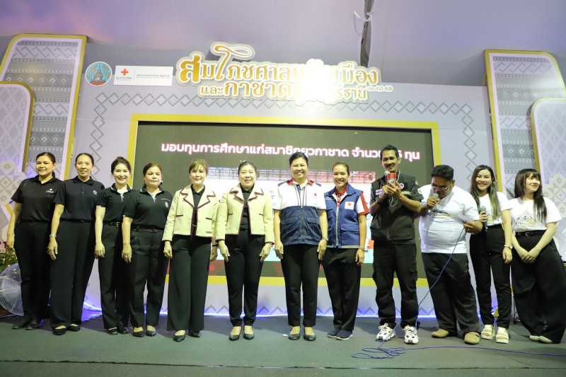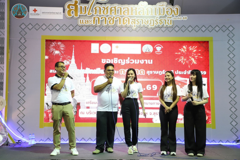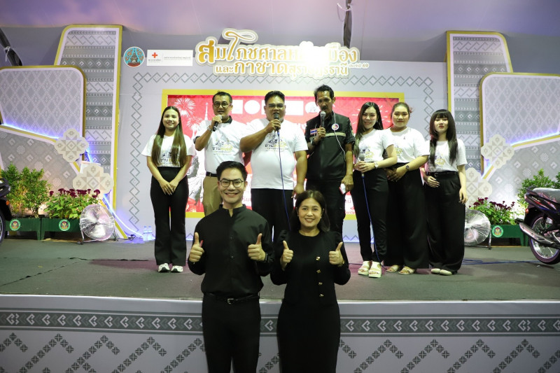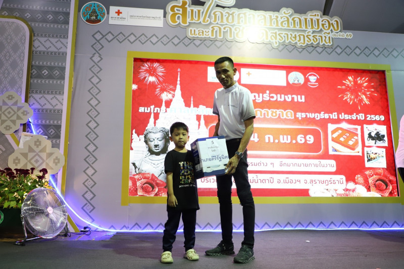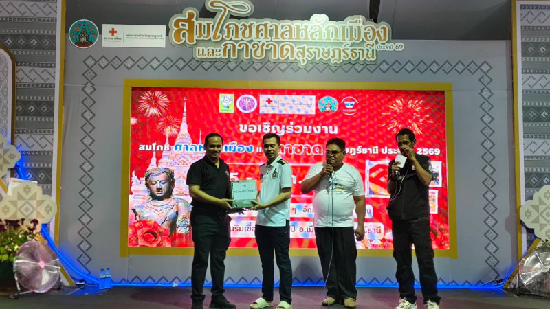 นายจุมพฏ วรรณฉัตรสิริ ผู้ว่าราชการจังหวัดสุราษฎร์ธานี พร้อมด้วยนางวีณา วรรณฉัตรสิริ นายกเหล่ากาชาดจังหวัดสุราษฎร์ธานี ร่วมงาน“สมโภชศาลหลักเมือง และกาชาดสุราษฎร์ธานี ประจำปี 2569” คืนที่สอง โดยมีนายบันดาล สถิรชวาล รองผู้ว่าราชการจังหวัดสุราษฎร์ธานี หัวหน้าส่วนราชการ นายอำเภอ เหล่ากาชาด และประชาชนจำนวนมากร่วมสร้างสีสันให้ค่ำคืนแห่งความสุข