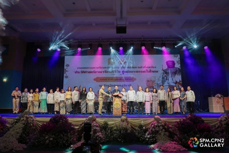 นายวิทศักดิ์ จำเริญนุสิต รองผู้ว่าราชการจังหวัดฯ กล่าวต้อนรับ เลขาธิการคณะกรรมการการศึกษาขั้นพื้นฐาน และผู้เข้าร่วมงานมหกรรมประวัติศาสตร์และหน้าที่พลเมือง ภายใต้หัวข้อ "ประวัติศาสตร์อาณาจักรศรีวิชัย ศูนย์กลางธรรมะในใจคน"