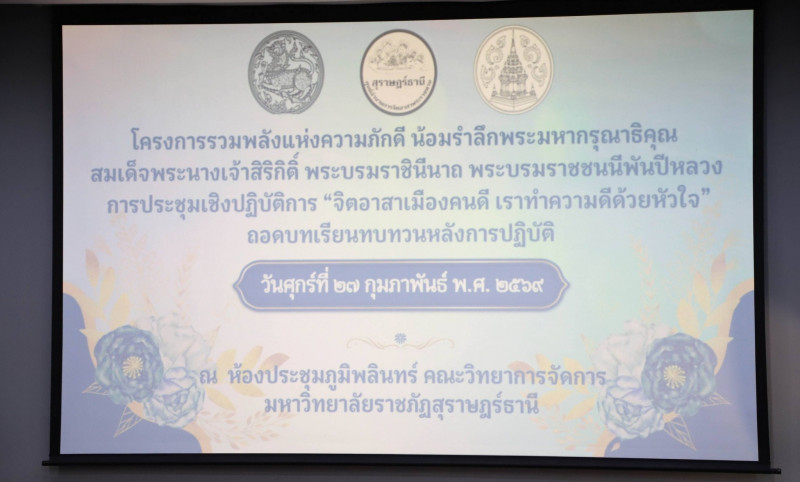 นายจุมพฏ วรรณฉัตรสิริ ผู้ว่าราชการจังหวัดสุราษฎร์ธานี เป็นประธานในพิธีเปิดโครงการรวมพลังแห่งความภักดี น้อมรำลึกพระมหากรุณาธิคุณ สมเด็จพระนางเจ้าสิริกิติ์ พระบรมราชินีนาถ พระบรมราชชนนีพันปีหลวง พร้อมกิจกรรมถอดบทเรียนการปฏิบัติงาน “จิตอาสาเมืองคนดี เราทำความดีด้วยหัวใจ” ณ มหาวิทยาลัยราชภัฏสุราษฎร์ธานี โดยมีนายชวลิต โรจนรัตน์ ปลัดจังหวัดสุราษฎร์ธานี หัวหน้าส่วนราชการ เจ้าหน้าที่ผู้รับผิดชอบงานจิตอาสา ศูนย์อำนวยการจิตอาสาพระราชทานอำเภอ นักศึกษา และภาคีเครือข่ายในพื้นที่เข้าร่วม รวมกว่า 250 คน