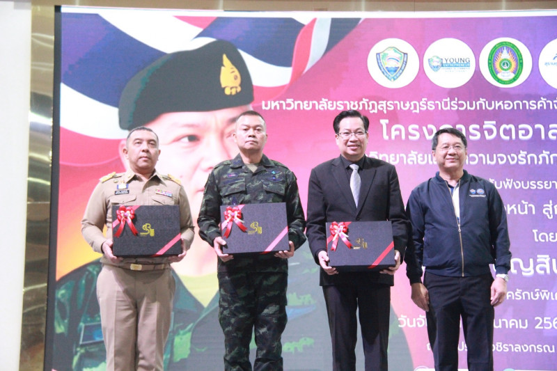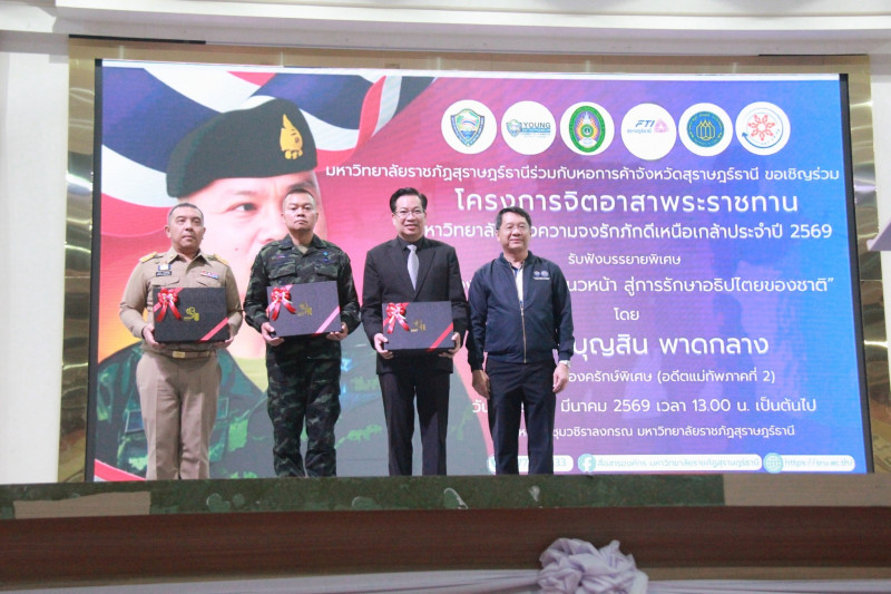 สำหรับกิจกรรมในวันนี้ จัดขึ้นโดยมหาวิทยาลัยราชภัฏสุราษฎร์ธานี ร่วมกับคณะกรรมการร่วมภาคเอกชน 3 สถาบันจังหวัดสุราษฎร์ธานี สมัชชาการศึกษาจังหวัดสุราษฎร์ธานี และภาคีเครือข่าย เพื่อเสริมสร้างความเข้าใจ สร้างพื้นฐานที่ถูกต้องเกี่ยวกับสถาบันหลักของชาติ ส่งเสริมพลังแห่งความจงรักภักดีให้แน่นแฟ้นยิ่งขึ้น รวมทั้งเพื่อขับเคลื่อนนโยบายจิตอาสา สนับสนุนการดำเนินงานของศูนย์อำนวยการจิตอาสาพระราชทานภาค 4 และนโยบายด้านจิตอาสาของมหาวิทยาลัยอย่างเป็นรูปธรรม.