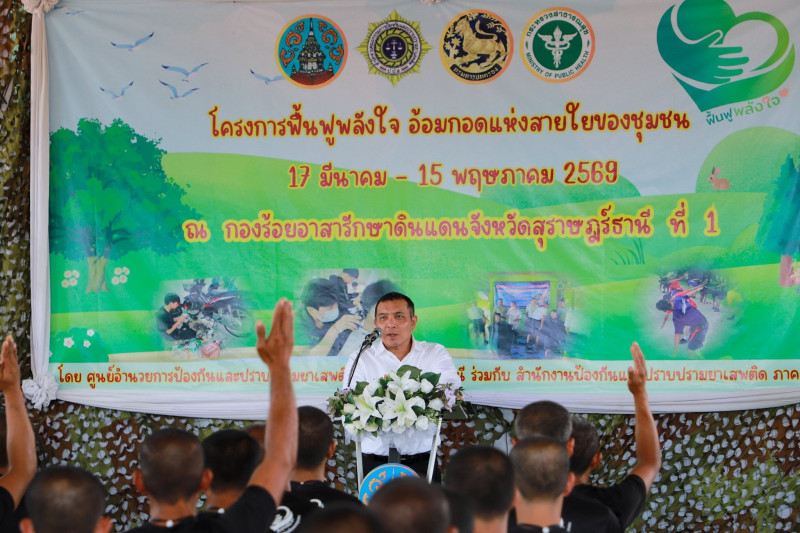 นายจุมพฏ วรรณฉัตรสิริ ผู้ว่าราชการจังหวัดสุราษฎร์ธานี เป็นประธานเปิด “โครงการฟื้นฟูพลังใจ อ้อมกอดแห่งสายใยของชุมชน จังหวัดสุราษฎร์ธานี” พร้อมด้วยนายจักรกฤษณ์ ฝั่งชลจิตร์ รองผู้ว่าราชการจังหวัดสุราษฎร์ธานี หัวหน้าส่วนราชการ สำนักงาน ป.ป.ส. ภาค 8 สำนักงานสาธารณสุขจังหวัด และหน่วยงานภาคีเครือข่ายเข้าร่วม เพื่อขับเคลื่อนการแก้ไขปัญหายาเสพติดแบบบูรณาการตามนโยบายเร่งด่วนของรัฐบาล โดยมุ่งลดระดับความรุนแรงของปัญหายาเสพติดในพื้นที่ โดยนำผู้เสพและผู้ติดยาเสพติดเข้าสู่กระบวนการบำบัดรักษาและฟื้นฟูสภาพทางสังคมแบบองค์รวม ครอบคลุมทั้งด้านร่างกายและจิตใจ ควบคู่กับการเตรียมความพร้อมก่อนคืนสู่สังคมผ่านการฝึกทักษะอาชีพ รวมถึงการสร้างเครือข่ายความร่วมมือระหว่างภาครัฐ เอกชน และภาคประชาชน เพื่อร่วมกันดูแล และติดตามผู้ผ่านการบำบัดอย่างใกล้ชิดและต่อเนื่อง