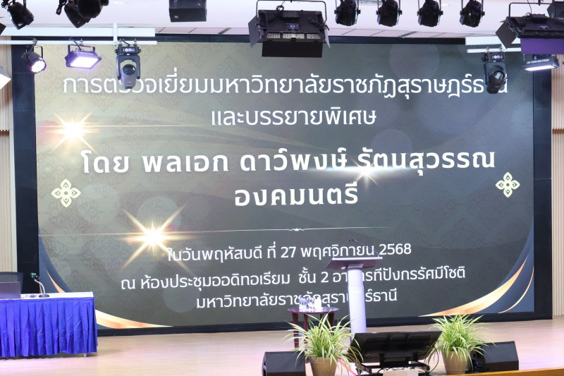 พลเอก ดาว์พงษ์ รัตนสุวรรณ องคมนตรี ตรวจเยี่ยมการดำเนินงานตามยุทธศาสตร์มหาวิทยาลัยราชภัฏเพื่อการพัฒนาท้องถิ่น ของมหาวิทยาลัยราชภัฏสุราษฎร์ธานี เพื่อน้อมนำพระบรมราโชบายของพระบาทสมเด็จพระเจ้าอยู่หัวด้านการศึกษาสู่การยกระดับมหาวิทยาลัยราชภัฏ โดยองคมนตรีได้บรรยายพิเศษเกี่ยวกับการขับเคลื่อนและสรุปผลการปฏิบัติงานตามบทบาทหน้าที่การเป็นมหาวิทยาลัยเพื่อการพัฒนาท้องถิ่นของกลุ่มมหาวิทยาลัยราชภัฏ