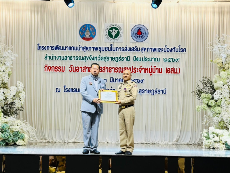 นายกล้าณรงค์ ยุติธรรม รองผู้ว่าราชการจังหวัดสุราษฎร์ธานี เป็นประธานเปิดโครงการพัฒนาแกนนำสุขภาพชุมชนในการส่งเสริมสุขภาพและป้องกันโรคจังหวัดสุราษฎร์ธานี ประจำปีงบประมาณ พ.ศ. 2569 กิจกรรม วันอาสาสมัครสาธารณสุขประจำหมู่บ้าน (อสม.) โดยรัฐบาลได้กำหนดให้วันที่ 20 มีนาคม ของทุกปีเป็นวันอาสาสมัครสาธารณสุขเพื่อเป็นการเชิดชูเกียรติ เผยแพร่ผลการดำเนินงานของ อสม.ให้เป็นที่ประจักษ์แก่สังคม