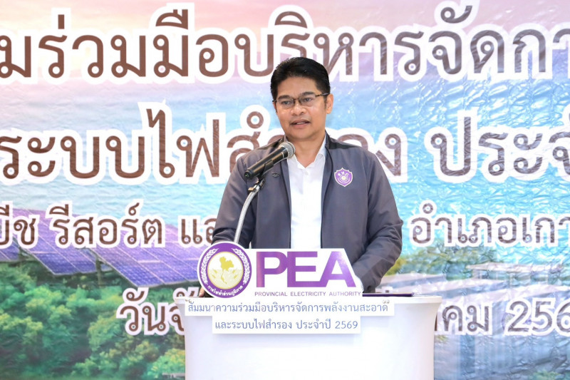 นายกล้าณรงค์ ยุติธรรม รองผู้ว่าราชการจังหวัดสุราษฎร์ธานี กล่าวต้อนรับในพิธีเปิดการสัมมนาความร่วมมือบริหารจัดการพลังงานสะอาด และระบบไฟสำรอง ในพื้นที่เกาะสมุย และพื้นที่ใกล้เคียง ประจำปี 2569 โดยมีนายประสิทธิ์ จันทร์ประสิทธิ์ รองผู้ว่าการภาคใต้ การไฟฟ้าส่วนภูมิภาค เป็นประธาน