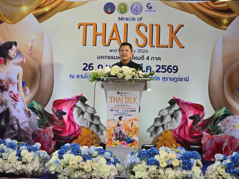 จังหวัดสุราษฎร์ธานีจัดงานมหกรรมหม่อนไหมดี 4 ภาค ประจำปี 2569 (Miracle of Thai Silk and Mulberry 2026) ณ ลานโปรโมชั่น ชั้น 1 ห้างสรรพสินค้าเซ็นทรัลสุราษฎร์ธานี อำเภอเมือง จังหวัดสุราษฎร์ธานี นายศรัญญู พูลลาภ อธิบดีกรมหม่อนไหม เป็นประธานเปิดงาน โดยมี นายจุมพฏ วรรณฉัตรสิริ ผู้ว่าราชการจังหวัดสุราษฎร์ธานี ให้การต้อนรับ พร้อมด้วย นางสาวรำแพน สารจันทึก ผู้อำนวยการสำนักงานหม่อนไหมเฉลิมพระเกียรติ เขต 5 หัวหน้าส่วนราชการ แขกผู้มีเกียรติ และประชาชนเข้าร่วมงานอย่างคึกคัก