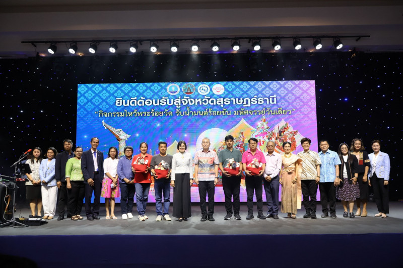 นายบันดาล สถิรชวาล รองผู้ว่าราชการจังหวัดสุราษฎร์ธานี ให้การต้อนรับคณะนักท่องเที่ยวจากจังหวัดต่างๆ กว่า 400 ชีวิต ที่เดินทางเข้ารวมงานประเพณีชักพระ - ทอดผ้าป่า และแข่งเรือยาวฯ ประจำปี 2568