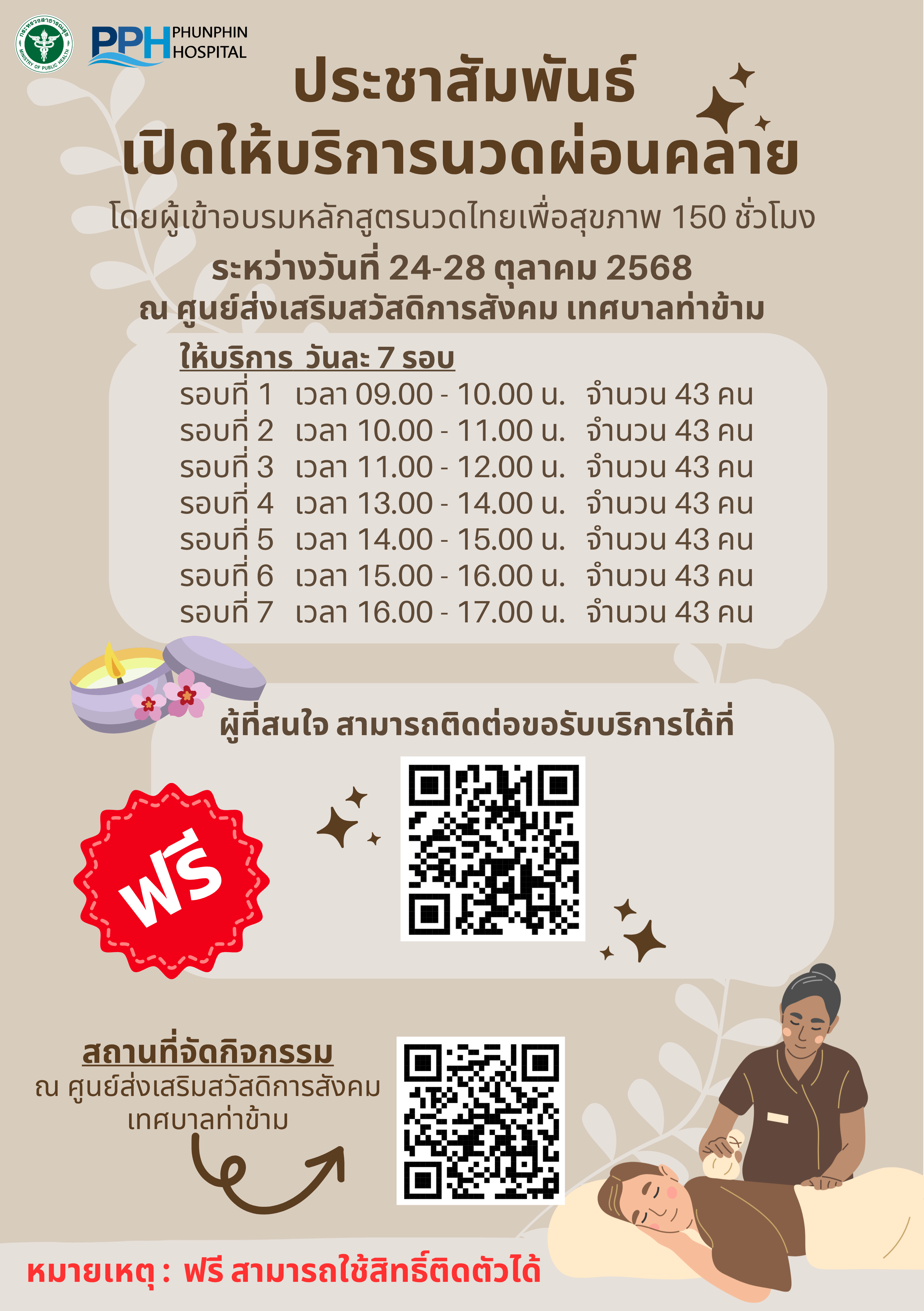 ขอประชาสัมพันธ์เปิดให้บริการนวดผ่อนคลาย ฟรี (โดยผู้เข้าอบรมหลักสูตรนวดไทยเพื่อสุขภาพ 150 ชั่วโมง) ระหว่างวันที่ 24-28 ตุลาคม 2568 ณ ศูนย์ส่งเสริมสวัสดิการสังคม เทศบาลท่าข้าม อำเภอพุนพิน จังหวัดสุราษฎร์ธานี สามารถสแกน QR code เพื่อติดต่อขอรับบริการ หรือเข้าไปติดต่อที่ห้องประชุม ชั้น 2 ศูนย์ส่งเสริมสวัสดิการสังคม เทศบาลท่าข้าม อำเภอพุนพิน จังหวัดสุราษฎร์ธานี ในวันและเวลาราชการ ภายใน 28 ตุลาคม 2568